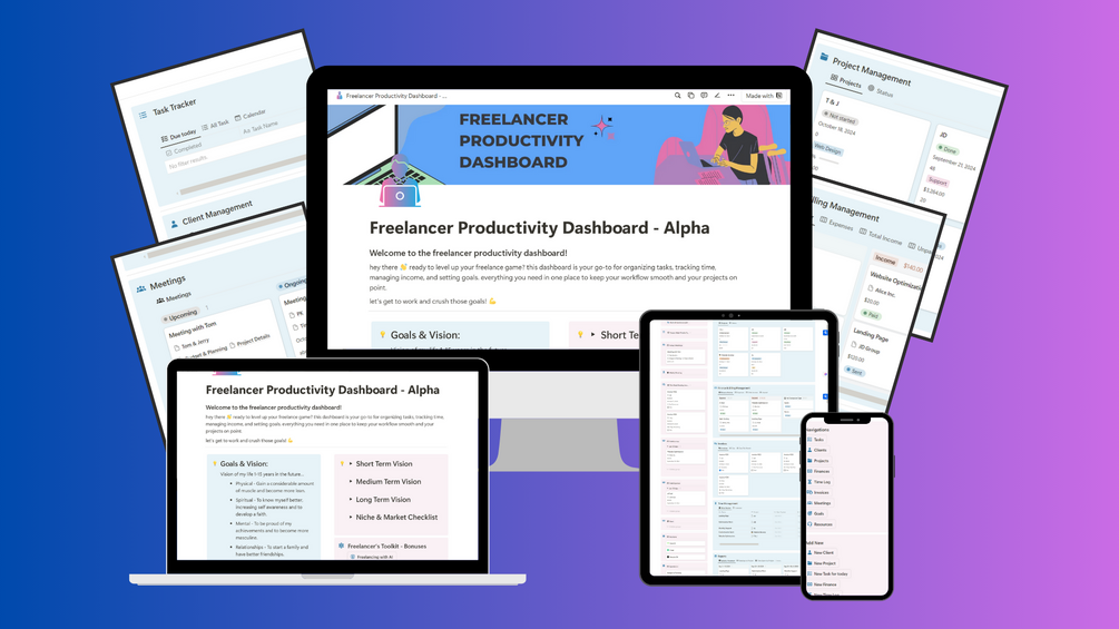 Boost your productivity and streamline your workflow with the Freelancer Productivity Dashboard! Designed specifically for freelancers and agency owners, this Notion template helps you manage tasks, projects, finances, and time tracking all in one place.